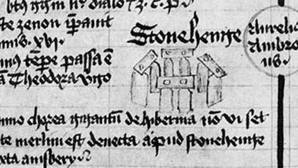 Stonehenge appears beside the name of Aurelius Ambrosius, with six lintels on each long side and one on each short. The words are very similar to those already described in the Douai manuscript, with the spelling "Stonhenges near Ambesbury". This part of the Cambridge manuscript is traditionally set in the first third of the 14th century, but the drawing can be more precisely dated. It was copied in a hand that differs from extensions after 1342. The last entry of the first hand is in 1338, so the fully integrated Stonehenge sketch must date from 1338–42. It is an almost exact contemporary of the drawing that shows Merlin.