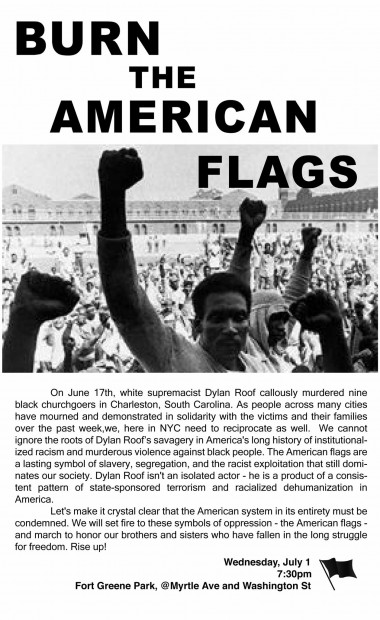 Organizers said accused Charleston shooter Dylann Roof wasn’t an “isolated actor,” but a “product of a consistent pattern of state-sponsored terrorism and radicalized dehumanization in America.” The event originally was aimed at burning the Confederate flag, but later changed to focus on the stars and stripes.
