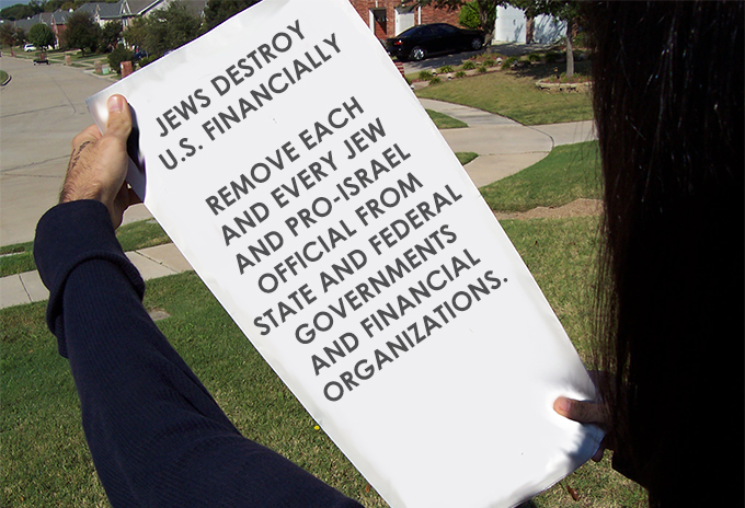 The two-page fliers are a compilation of photocopied quotations from anti-Semitic documents. “Remove each and every Jew and Pro-Israel official from state and federal governments and financial organizations,” one corner of the flier says. The heading at the top of the flier is: “Jews Destroy U.S. Financially.”