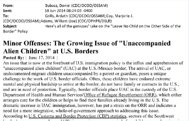 In an unrelated email dated June 18, 2014, CDC Intelligence Analyst Daniel Bubacz describes the situation as a, “Leave No Child on the other Side of the Border Policy.” This refers to a disastrous federal education law known as No Child Left Behind aimed at improving the long suffering academic performance of minorities in the nation’s public schools. More than a decade and tens of billions of dollars later, the measure failed to significantly increase the academic performance of the targeted demographic and is best known as a massive fleecing of taxpayer dollars.
