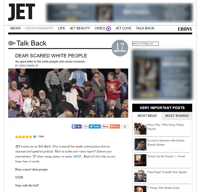 I recently had the misfortune of reading your piece in JET titled “Dear Scared White People.” Its overall thrust – that white people are voting for Donald Trump because they are irrationally fearful – is both common and vapid. My biggest objection is that you mistake caution for fear. White people – or any people, for that matter – needn’t be “afraid” of something undesirable to avoid it. In fact, avoiding such an undesirable situation is indeed the only rational option, but whenever white people advocate for something in their ethnic interests, they are accused of acting out of fear. Why is this only purported to be the case with whites? Nevertheless, white Americans ought to be concerned with what’s happening in this country.