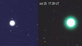 The gaseous cloud surrounding the comet's core more than doubled in radius on Oct. 25th. "I captured these images on consecutive nights using the same equipment (a 14-inch LX200 GPS) and similar exposure times (10x1s)," says photographer Eduardo Hernandez of Torreon, Mexico. This follows an even more astonishing million-fold increase in brightness on Oct. 23th.
