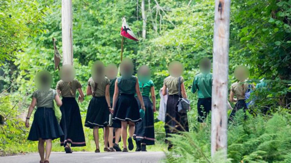 The school-age children are drilled for a week. Wearing uniform-style outfits and sporting traditional hairstyles, they take part in flag ceremonies, physical exercise and other activities at a remote location in the forested Småland province. Expo and Kvällsposten have documented the German organization "Sturmvogel" and their camp week in Sweden.