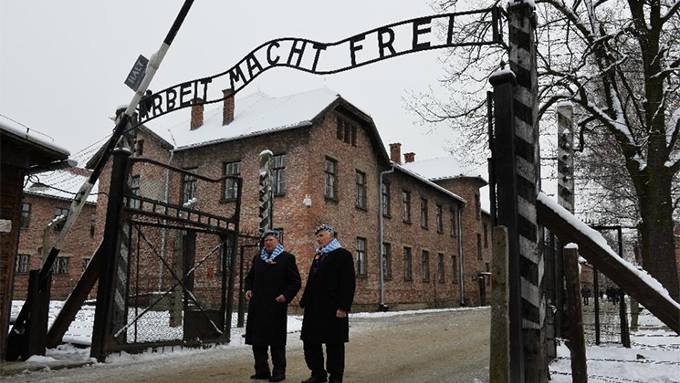 It features the German words "Jedem das Seine" (To Each His Own) -- the message at the front gate of the Buchenwald concentration camp -- and a picture of the former Auschwitz death camp in occupied Poland with barbed wire fences.