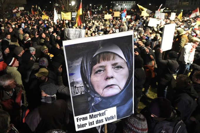 A recent anti-invasion protest in Germany portrays Angela Merkel as a hijab-wearing traitor.