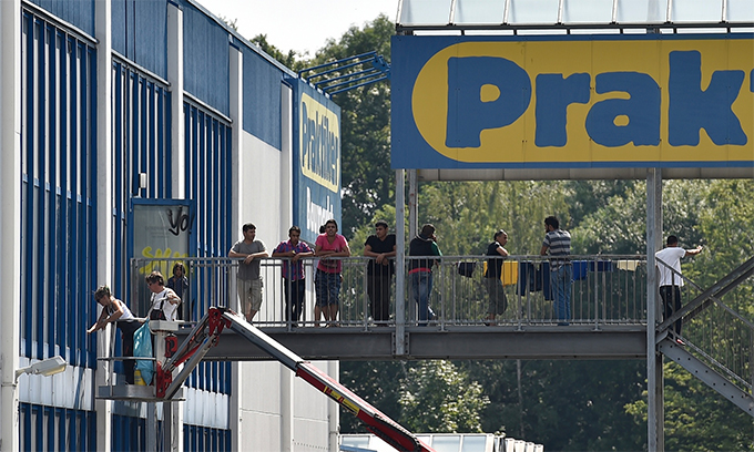 Asylum seekers stand on the steps of the new shelter in Heidenau, set up in a disused DIY store. Photograph: Matthias Rietschel/Getty Images