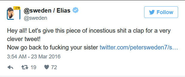 When someone tweeted that Kreidy didn’t represent Swedes, Kreidy responded by telling him to “go back to fucking your sister”.