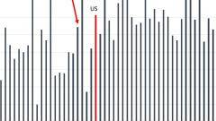 The nationwide median income for the US is in red. To the left of the red column are other OECD countries, and to the right of the red bar are individual US states. These national-level comparisons take into account taxes, and include social benefits (e.g., "welfare" and state-subsidized health care) as income. Purchasing power is adjusted to take differences in the cost of living in different countries into account.