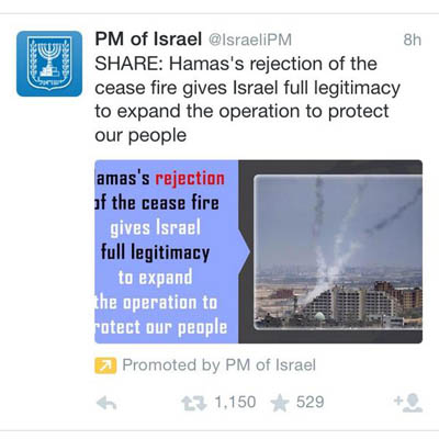 PM Netanyahu steps up PR efforts on social mediaUsing public relations efforts to build public support for military action is not a new idea. But spending money on tweets to shape global perceptions may be the next frontier for such efforts. Hayes Brown, Editor at Foreign Policy, posted this screenshot of a promoted tweet from the official Twitter account of the Prime Minister of Israel, seeking to build support for an escalation of Israeli military operations in Gaza.