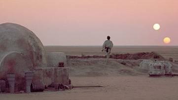 ![]() A still from Star Wars: Episode IV - A New Hope. After discussing his future plans with his Uncle Owen, Luke Skywalker leaves the Lars Homestead and heads towards the vista to watch the twin suns of Tatooine set while he reflects upon his destiny. © Lucasfilm Ltd. & TM. All Rights Reserved. |
