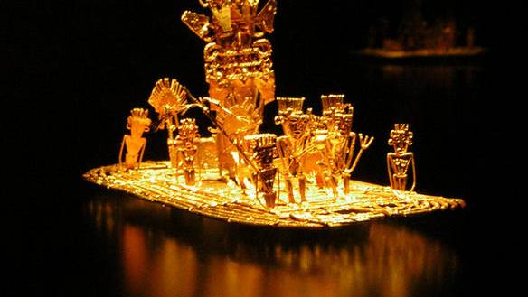 Surrounded by the four highest priests adorned with feathers, gold crowns and body ornaments, the leader, naked but for a covering of gold dust, would set out to make an offering of gold objects, emeralds and other precious objects to the gods by throwing them into the lake.