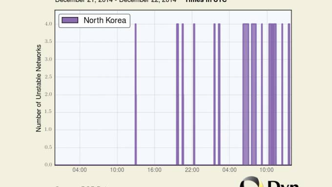 North Korea is having serious connectivity issues this morning, North Korea Tech reports. The country has extremely limited web infrastructure to begin with, but reports from Dyn indicate the country's infrastructure has suffered a series of major outages over the past 24 hours. As a result, anyone at a North Korean IP would have found it nearly impossible to connect to the web. "I haven’t seen such a steady beat of routing instability and outages in KP before," said Doug Madory, director of internet analysis at Dyn Research, told North Korea Tech. "Usually there are isolated blips, not continuous connectivity problems. I wouldn’t be surprised if they are absorbing some sort of attack presently." The premise is particularly relevant given recent statements by President Obama, which promised a "proportional response" to the recent attack on Sony.