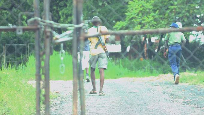 Guarded: A man wielding an AK-47 pictured at the farm in Zimbabwe, which is padlocked shut and deserted