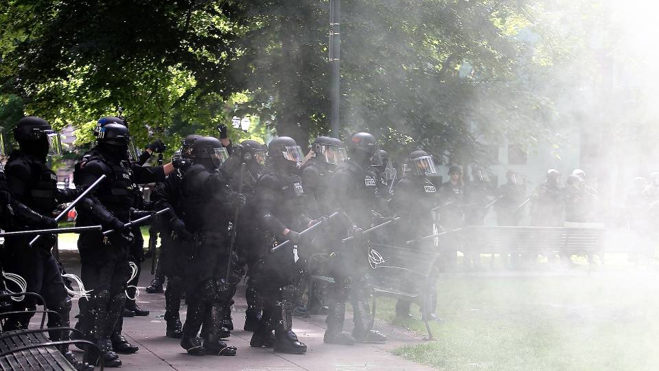 By late afternoon, police closed nearby Chapman Square where a separate group of protesters – many wearing masks and black clothing and identified as anti-fascists – also demonstrated. Police used flash-bang grenades and pepper balls to disperse that crowd after saying protesters were hurling bricks and other objects at officers.