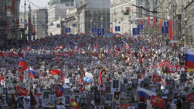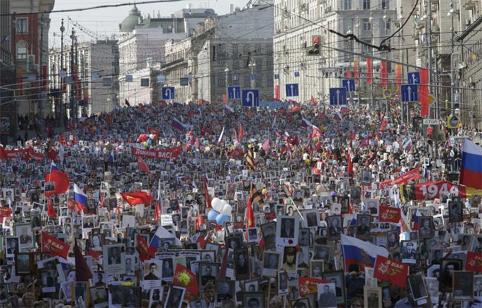 People hold pictures of World War Two soldiers as they take part in the Immortal Regiment march during the Victory Day celebrations in central Moscow, Russia, May 9, 2015. A Russian teen faces prosecution after reportedly posting a pro-Nazi photo online during the day marking Russia's victory over Nazi Germany. Reuters