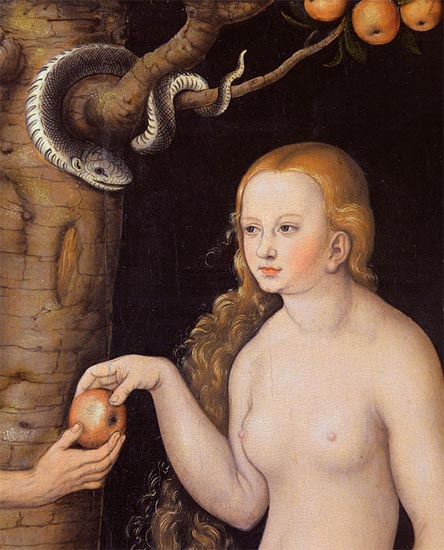 Eve Offering The Apple To Adam In The Garden Of Eden And The Serpent by Lucas Cranach the Elder (c.1520)