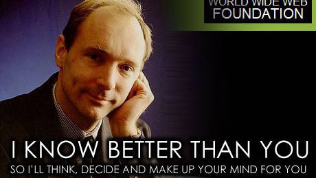 "Sir" Tim Berners-Lee, the "creator" of the World Wide Web (together with Al gore of course) is trying to wreck the World Wide Web and destroy everything the web has come to represents: a way of spreading ideas, "new" ideas, diversity, a free flow of opinions, thoughts (Freedom of speech), alternative sources that differs from the “memestream” and a myriad of possibilities that you can explore and investigate for yourself without anyone telling you what to think or what is “correct”.