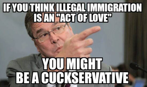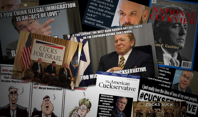 The cuckservative meme is suddenly everywhere. It’s brash, it’s witty, and it’s often embedded in visually appealing graphics — a new art form really (see collection here). It’s effective partly because its messages are short and simple. The SPLC, NYTimes, ADL et al. have been using this strategy for decades. Terms like “White supremacist,” “racist,” “anti-Semite” “Nazi” have been devastatingly effective, but they are only effective because they are disseminated by our hostile elites. It’s no accident that, Jeet Heer, writing in The New Republic, says that the cuckservative meme originated in “the white supremacist movement.”