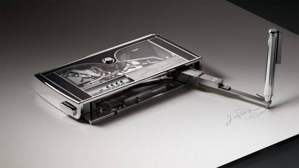 I bet you didn’t even know portable signing machines existed, did you? Well, technically they didn’t, until recently. Swiss watchmaker Jaquet Droz finally unveiled its impressive Signing Machine last month, at the Baselworld Watch Show, after reportedly working on it for the last four years. It showcases the company’s mechanical clockwork technology, only instead of doing it by accurately telling time, it replicates your signature to perfection.