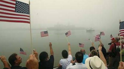 Families, couples, business leaders and a high school marching band crowded on the river's levees to glimpse the ship through the soupy haze. A bagpiper, Terry Cooney, played the Marines' Hymn and Scotland the Brave.