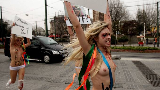 It’s the Ukranian feminist group that embarrassed President Putin. Its activists have staged many protests against sexual and political repression by stripping to their waists in carefully choreographed media stunts.