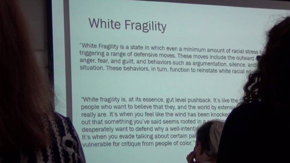 The presenter, Melinda Bullen, goes on to desrcribe the “emotions and behaviors” of white fragility: “If we identify as an ally, there’s a danger in reveling and feeling special for doing the work. But ultimately that takes away, and puts attention back on the white person” The emotions include Guilt, anger, relational, anesthetization, dismissiveness, disconnection, social impotence, silence, Appreciation or exaltation, and fear.